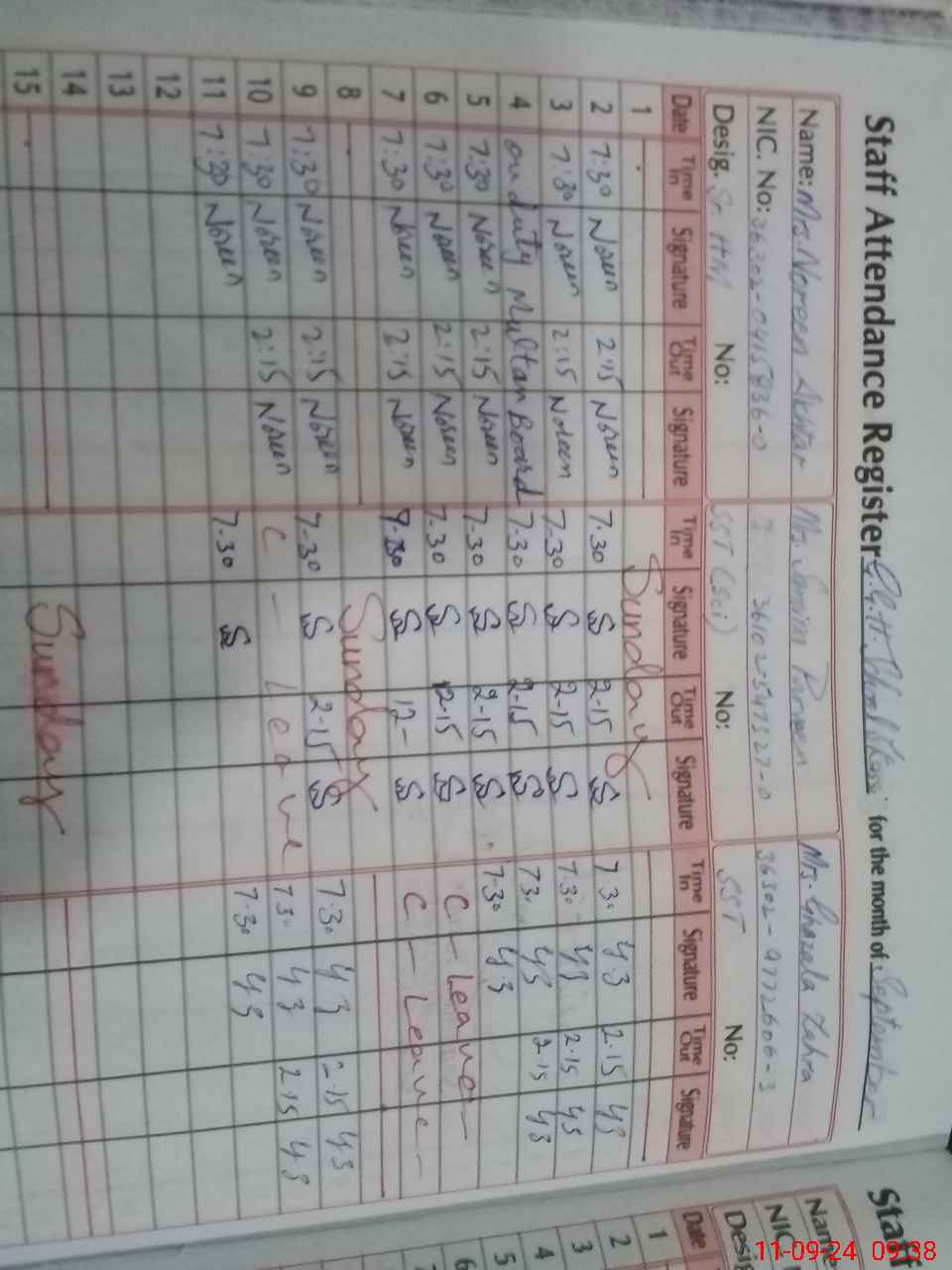 | CNIC | Full Name | Designation | R/C | Absence During Last Calender Month |