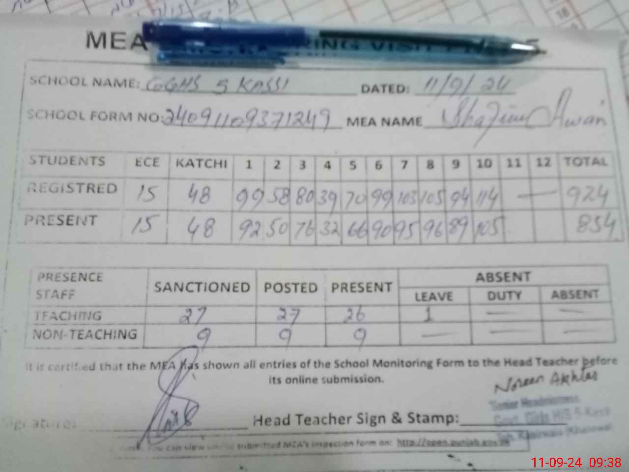 | Attendance Register | Head Teacher | MEA with School | Visit Proof |