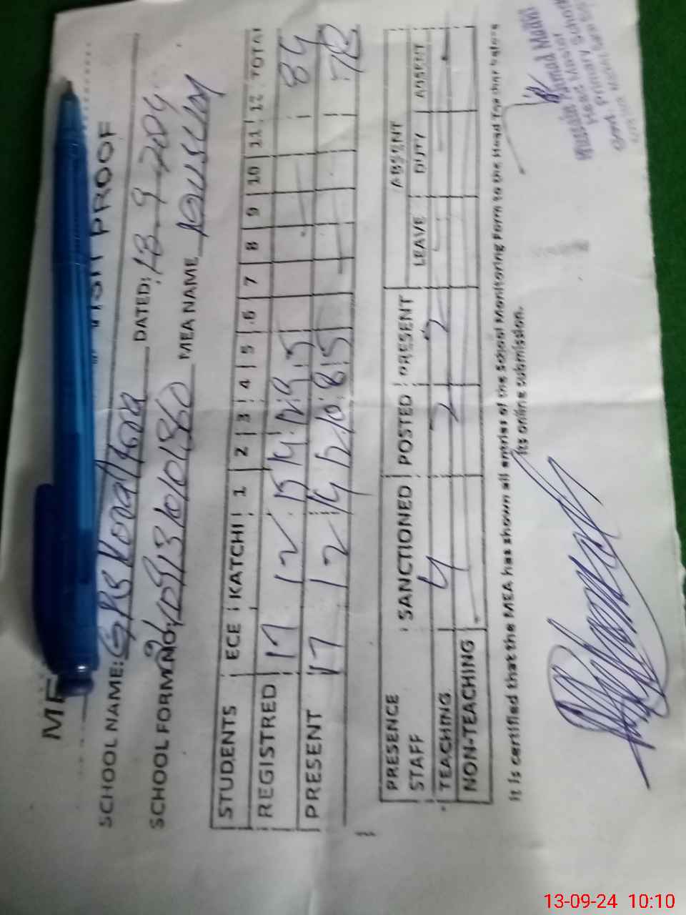 | Attendance Register | Head Teacher | MEA with School | Visit Proof |
