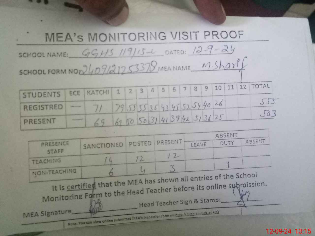| EMIS Code: 36430090 | Name of School: GGHS 119/15-L, MIAN CHANNU | |||