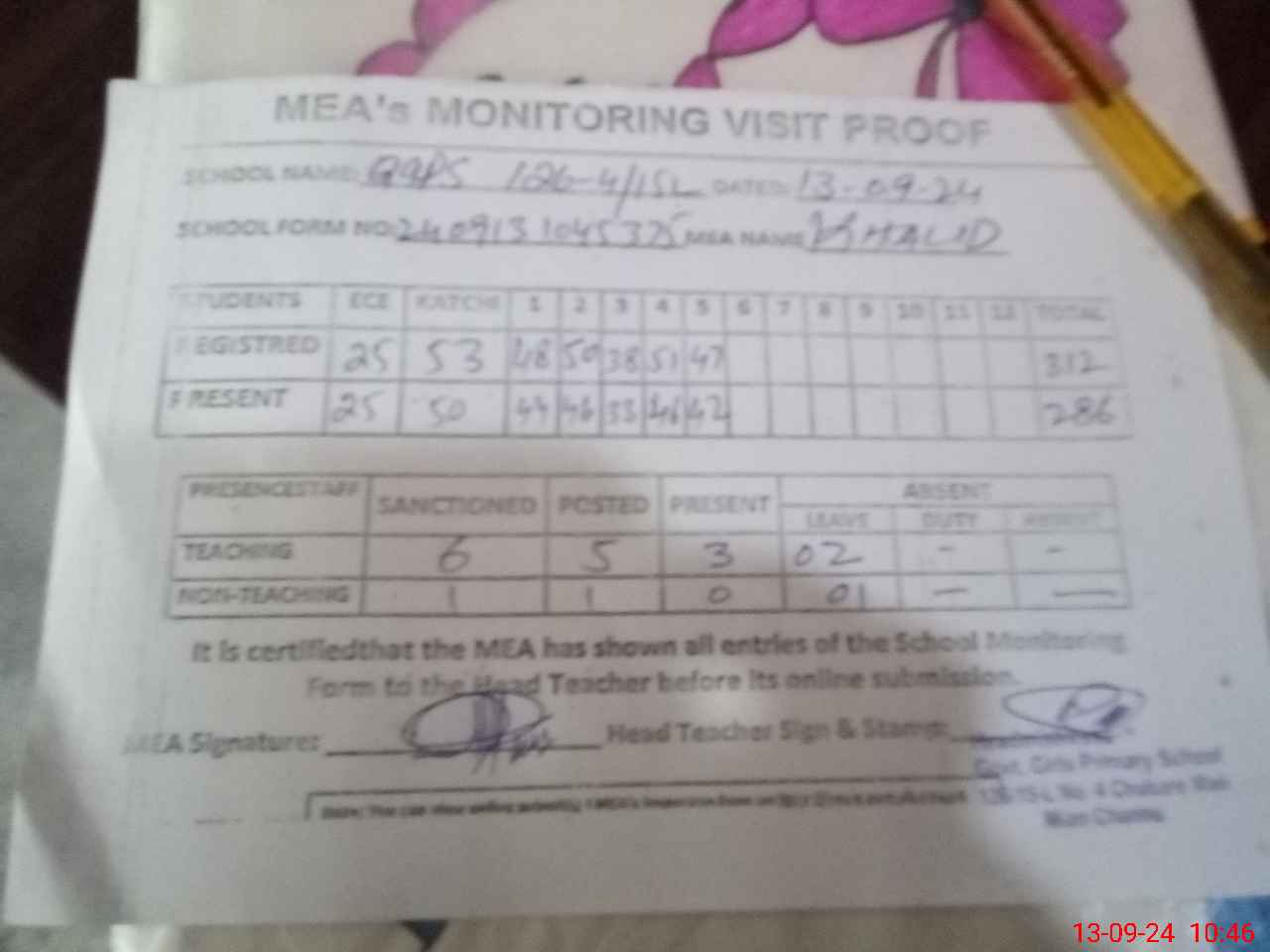 | Attendance Register | Head Teacher | MEA with School | Visit Proof |