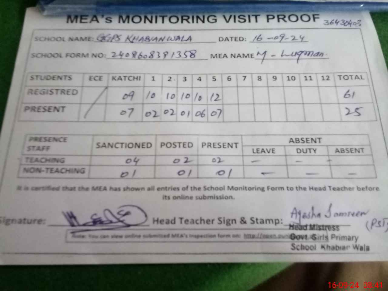 | Attendance Register | Head Teacher | MEA with School | Visit Proof |