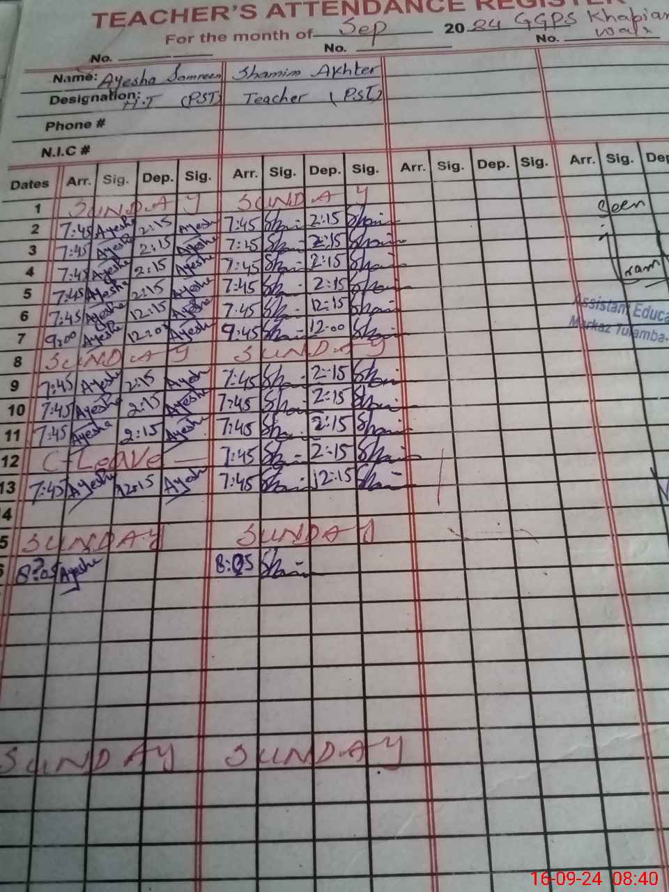 | Name: Ay**** Sa**** Designation: (School Headmaster's/Headmistress's) PST/PTC/JV Phone/Cell Number: 03**** |