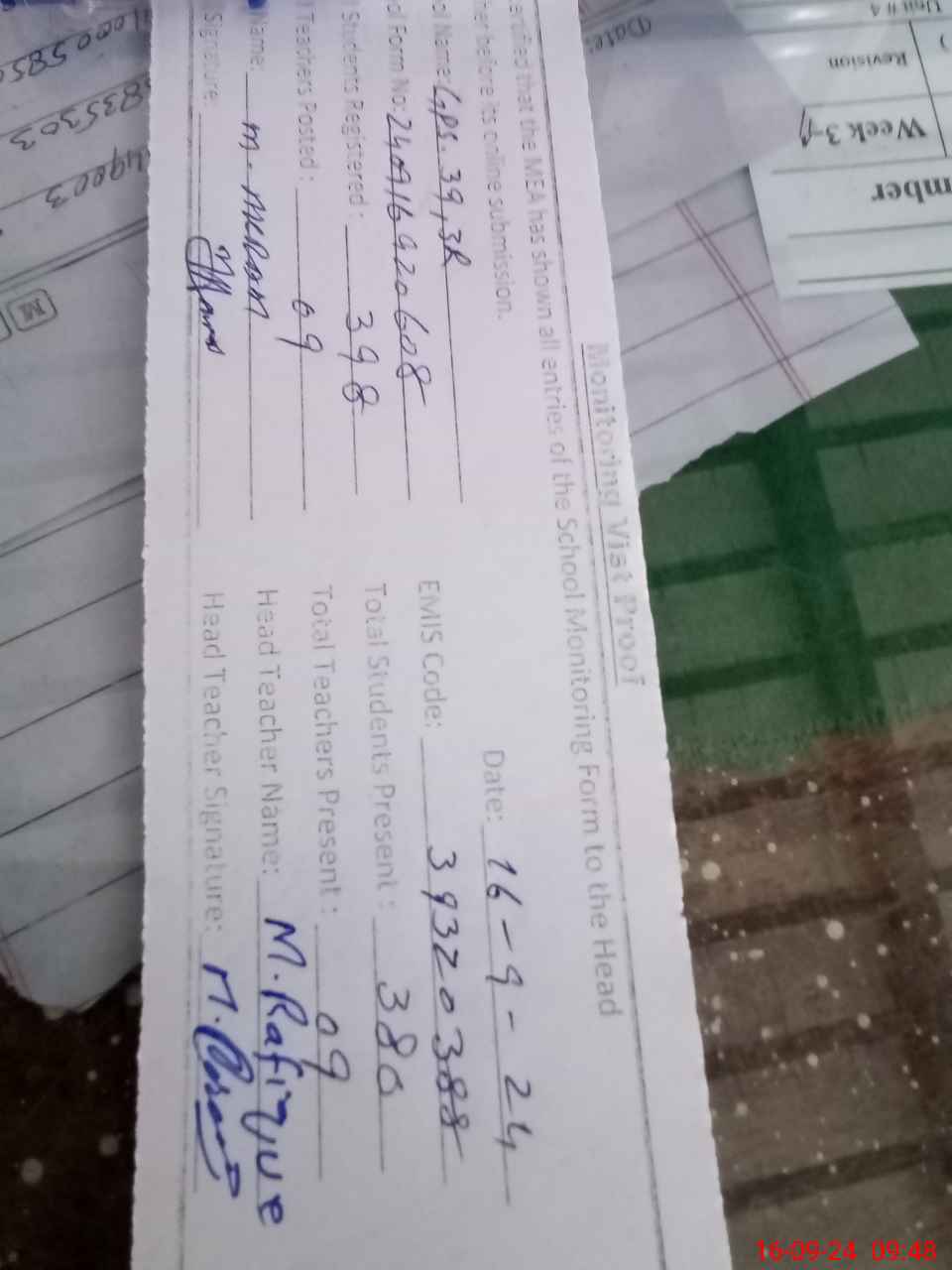 | Attendance Register | Head Teacher | MEA with School | Visit Proof |