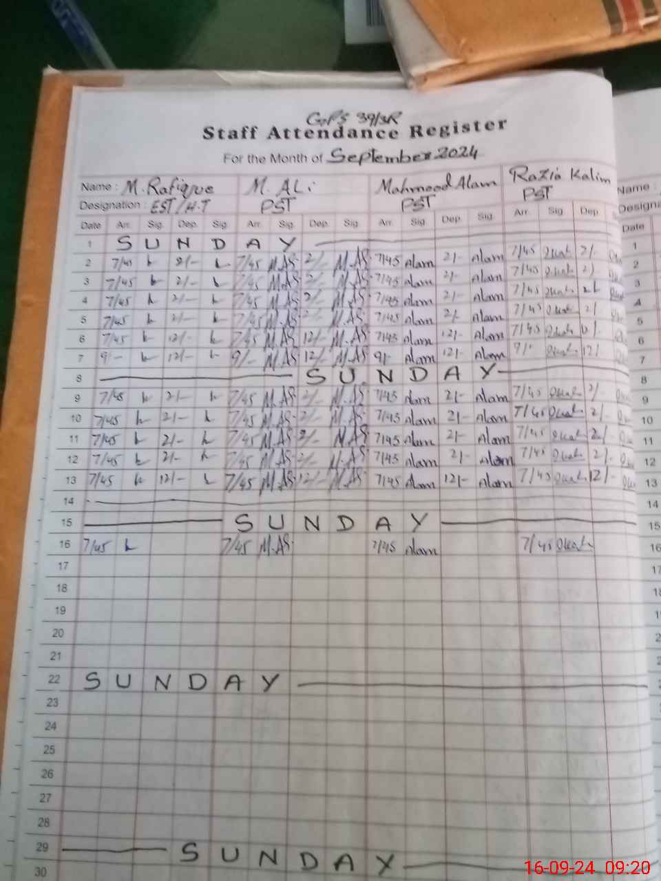 | Monitoring Date: 16-09-2024 | Start Time: 16-09-2024 09:19 AM | End Time: 16-09-2024 09:50 AM | Name of MEA: MU**** AK**** (R**** | |