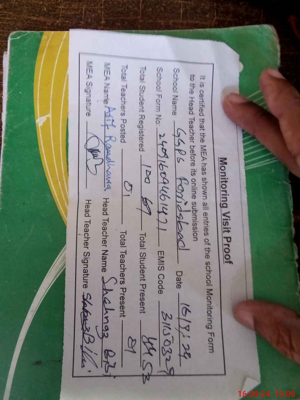 | Remarks (Use Separate Page if Required): School located in private building in congested atmosphere with one small room and branda No visit by AEO after April No NSB record maintained One toilet not functioning due to not cleaned Drinking water in mud utensils gharra Solar inverter not installed Very low attendance | |||||