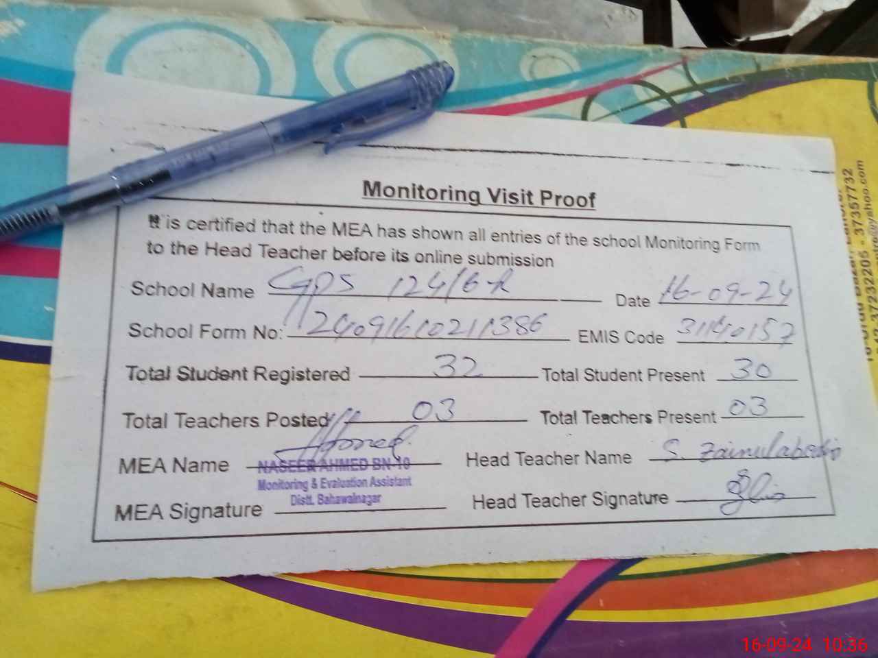 | Attendance Register | Head Teacher | MEA with School | Visit Proof |