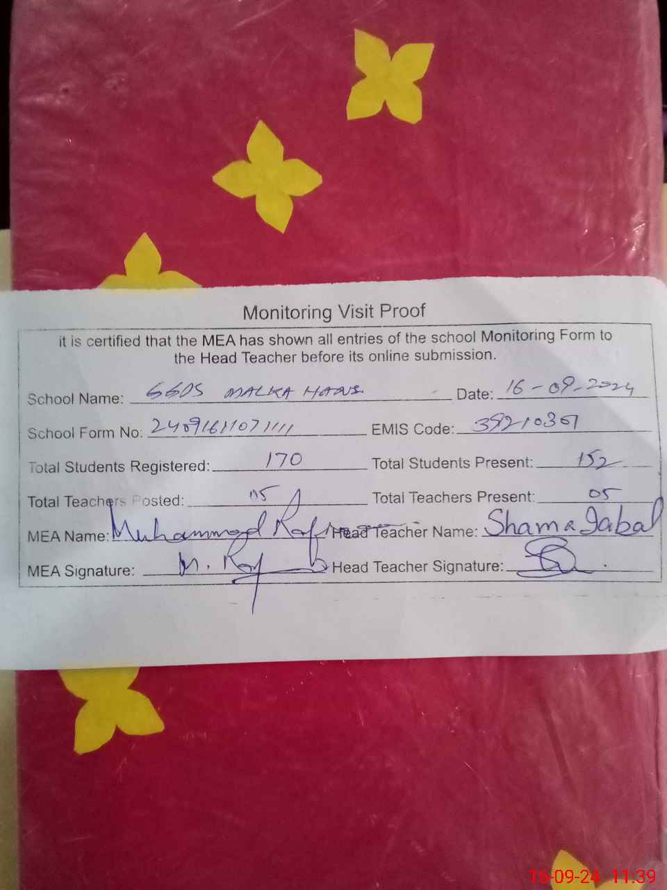 | Certified that this School was Inspected by the Undersigned MEA/DMO Today and the Information Stated Above is as Per Record. | |||||