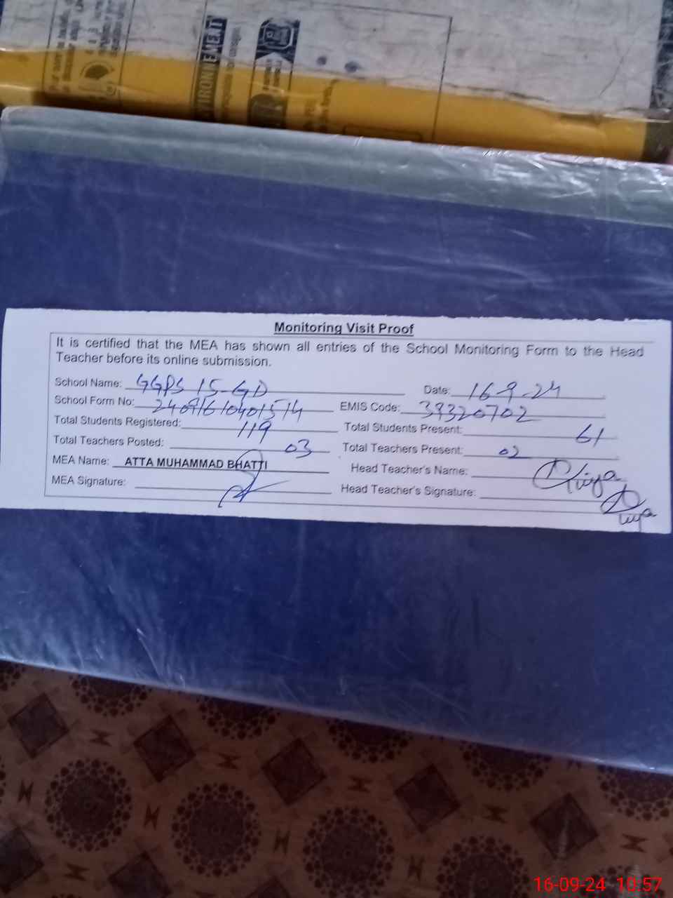 | Attendance Register | Head Teacher | MEA with School | Visit Proof |