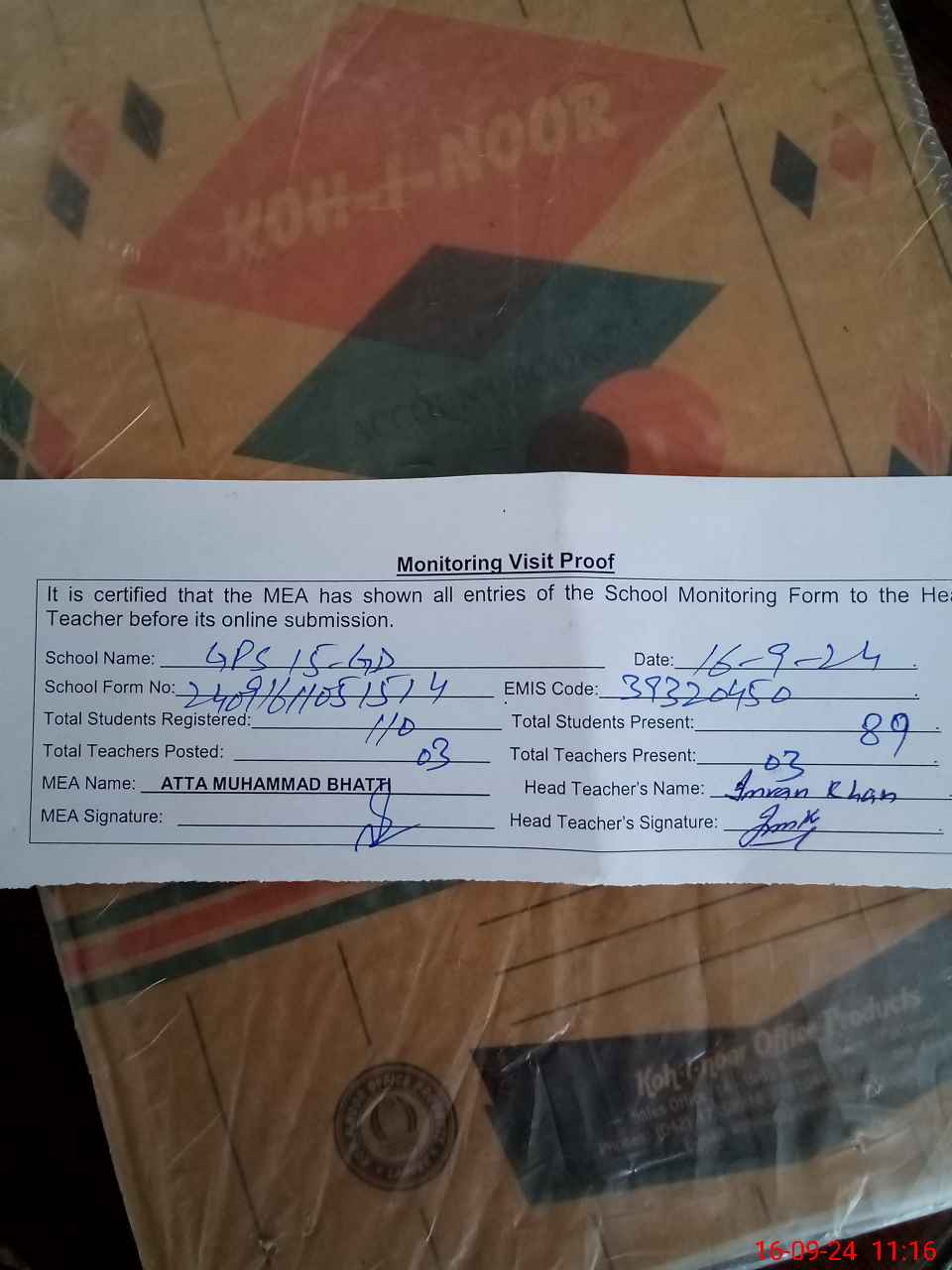 | EMIS Code: 39320450 | Name of School: GES CHAK NO. 15/G.D | |||
