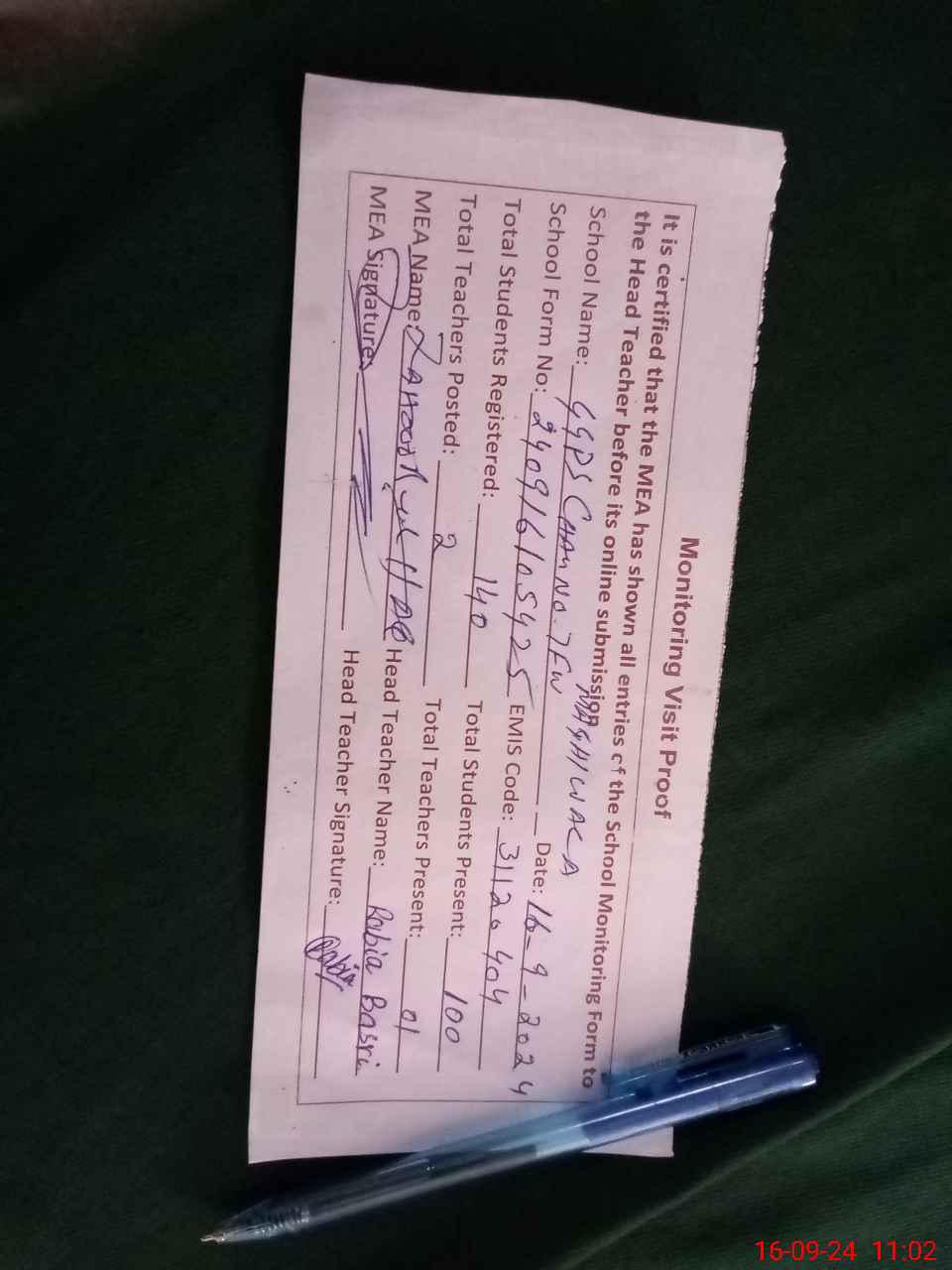| Attendance Register | Head Teacher | MEA with School | Visit Proof |