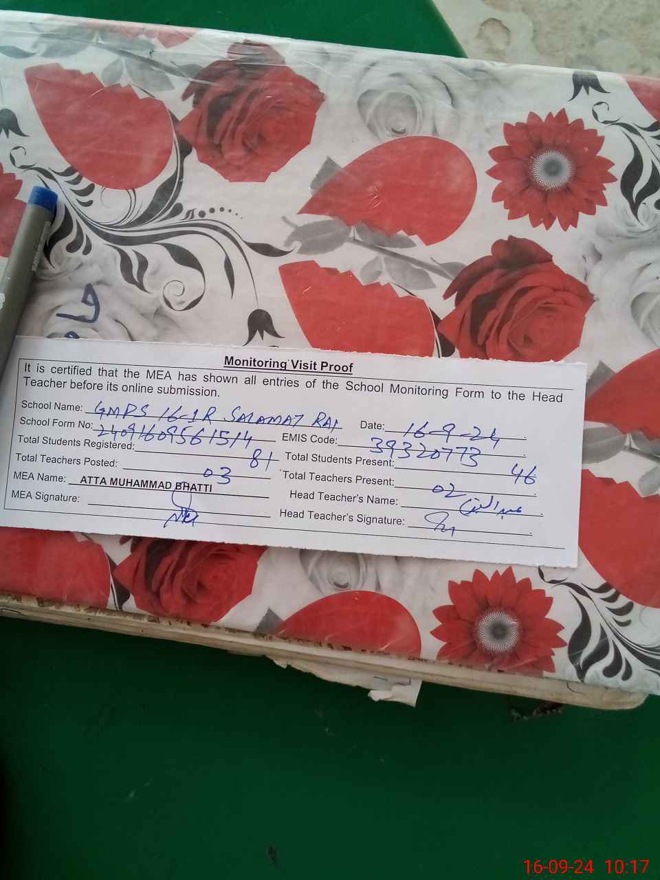 | EMIS Code: 39320773 | Name of School: GMPS CHAK NO. 16/1-R SLAMAT RAI | |||
