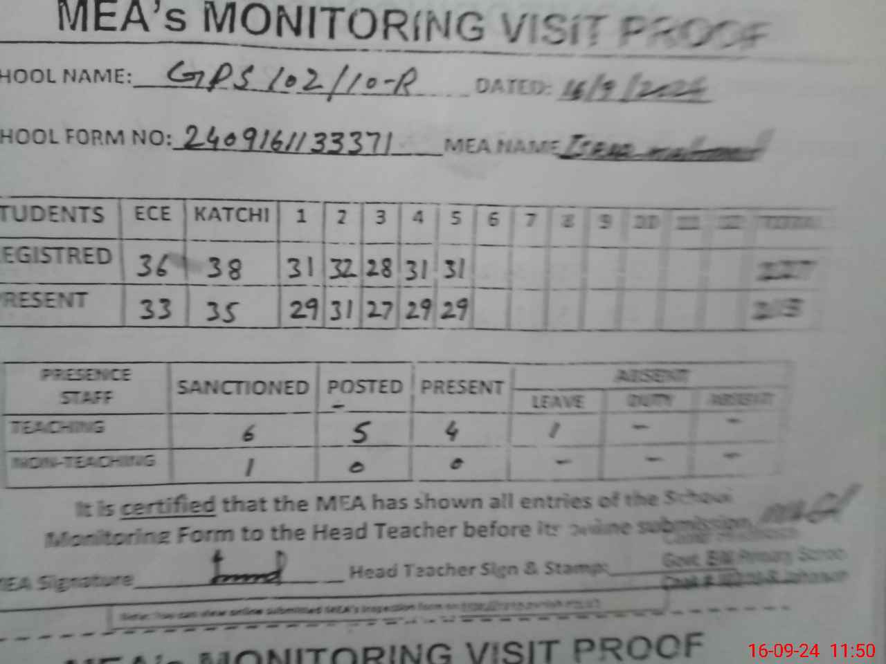 | Attendance Register | Head Teacher | MEA with School | Visit Proof |