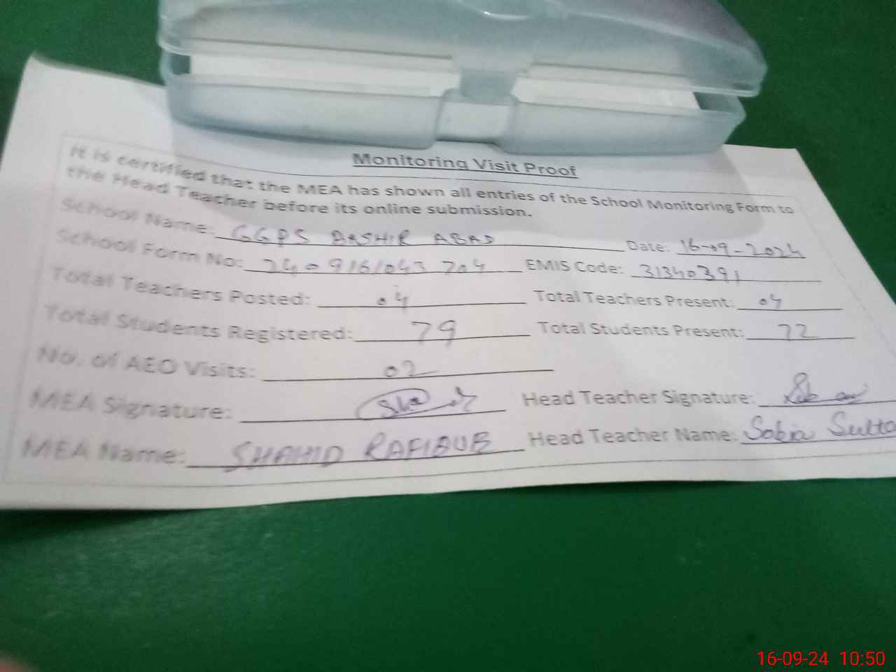 | Attendance Register | Head Teacher | MEA with School | Visit Proof |