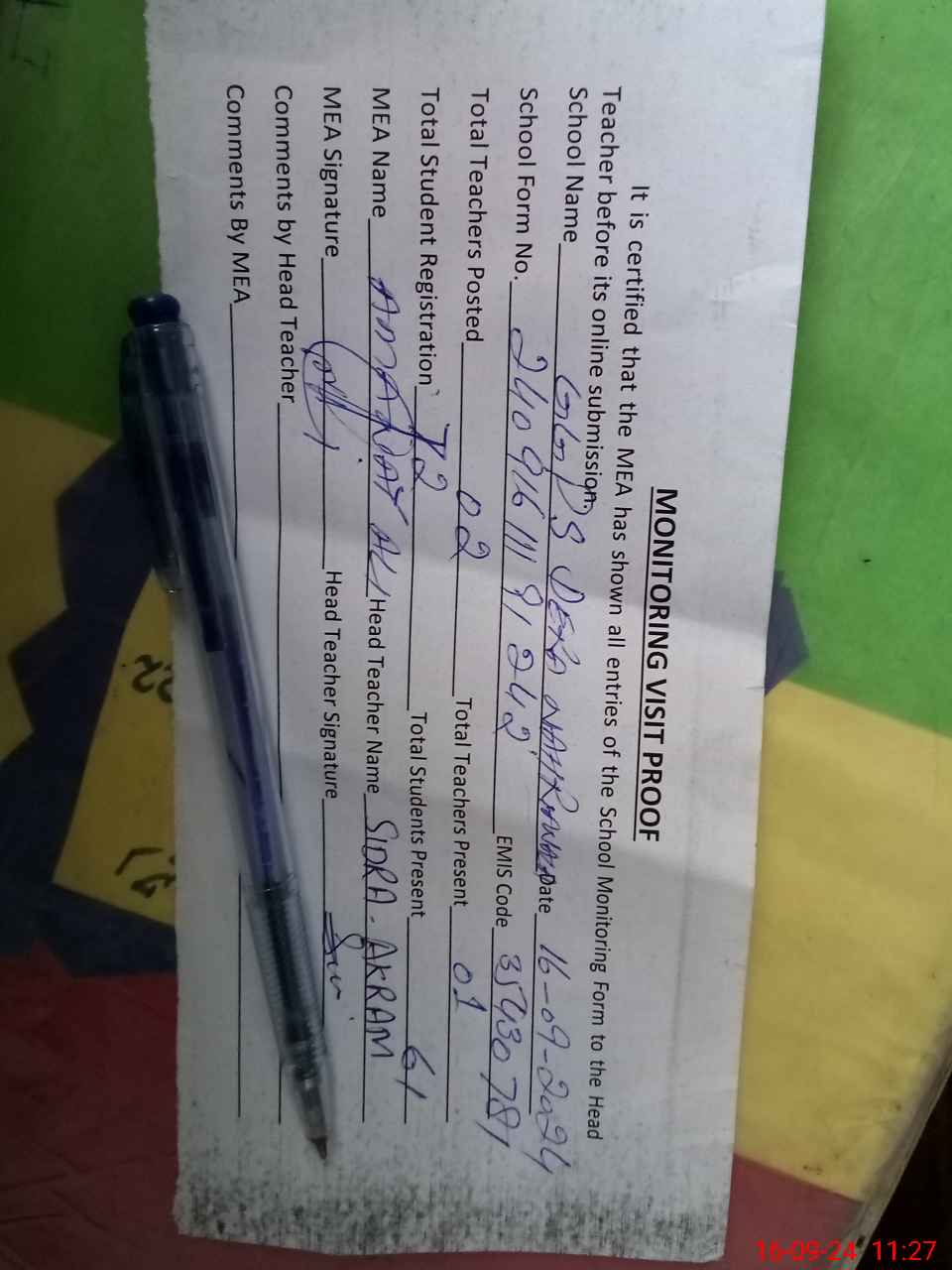 | Attendance Register | Head Teacher | MEA with School | Visit Proof |