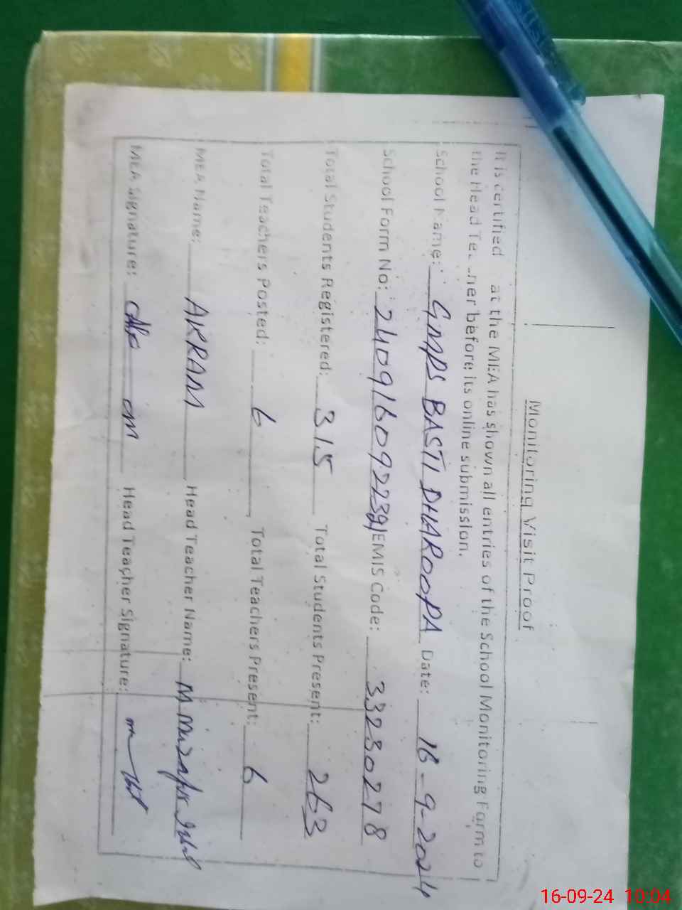 | Attendance Register | Head Teacher | MEA with School | Visit Proof |