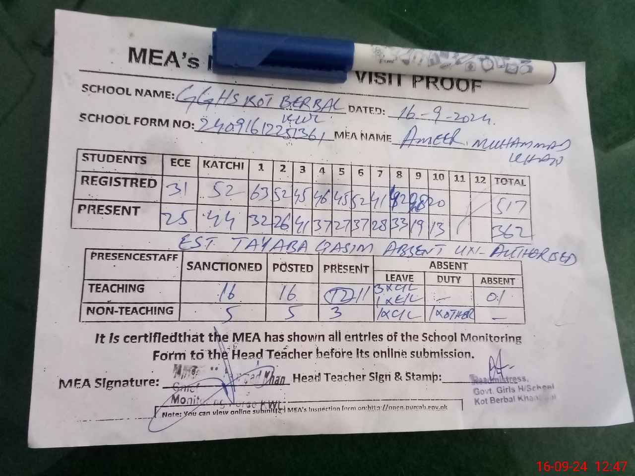 | EMIS Code: 36420090 | Name of School: GGHS KOT BEERBAL, KHANEWAL | |||