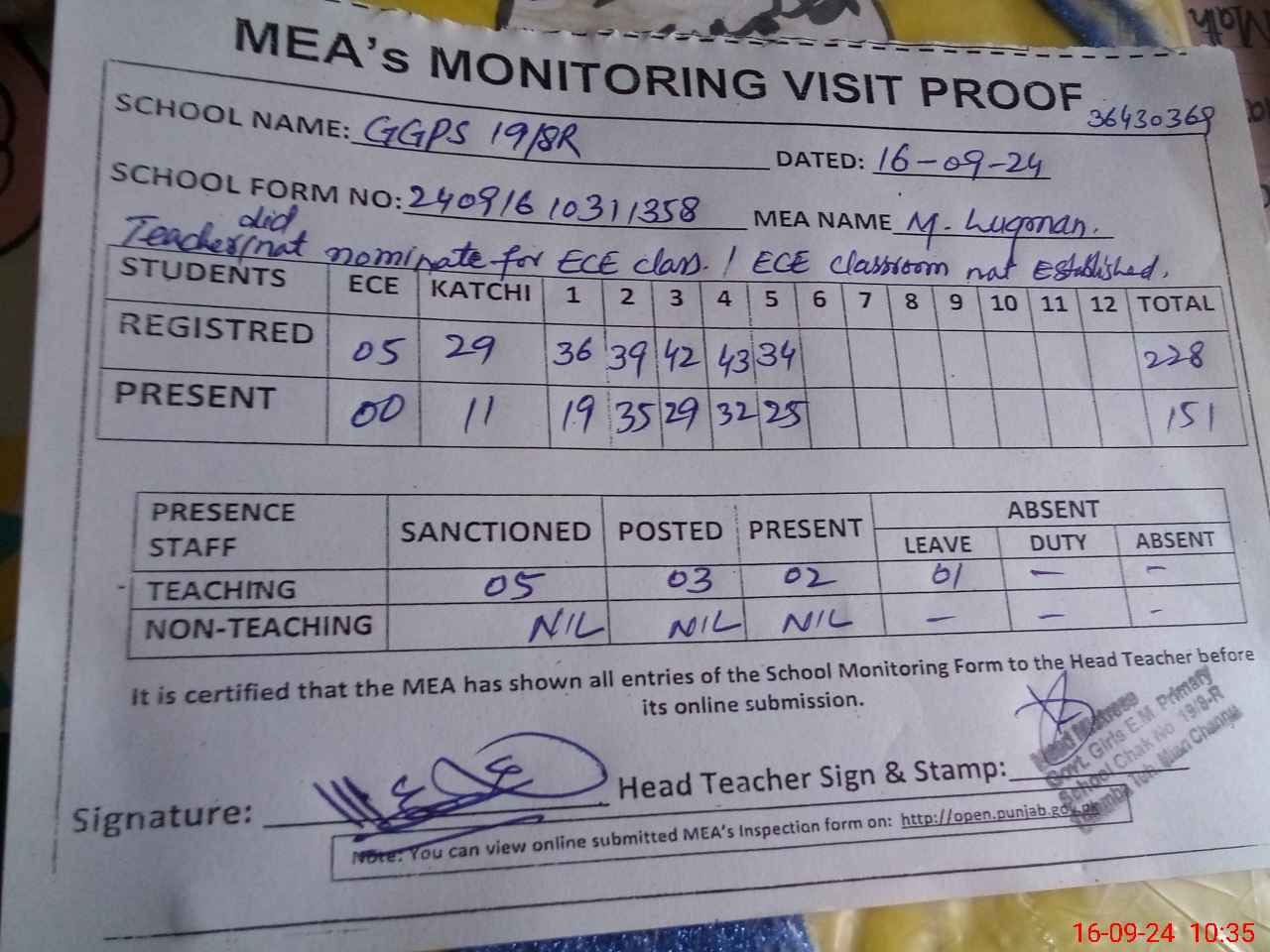 | Attendance Register | Head Teacher | MEA with School | Visit Proof |