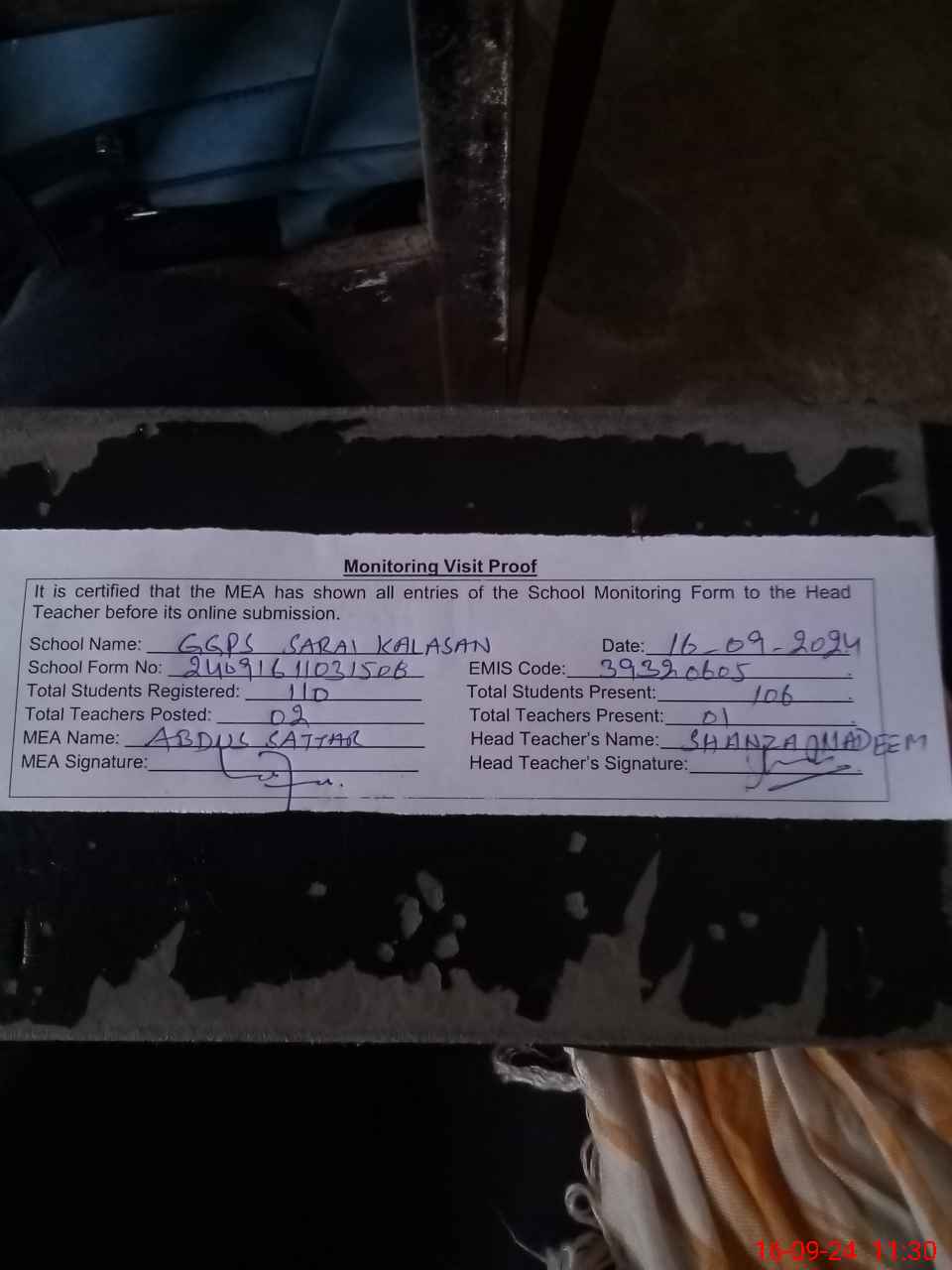 | Attendance Register | Head Teacher | MEA with School | Visit Proof |