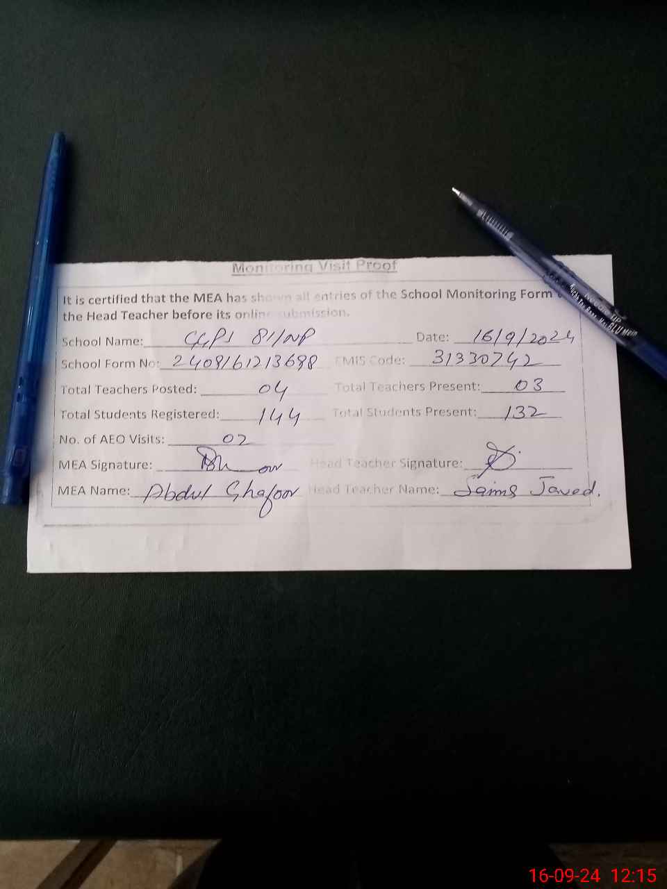 | Attendance Register | Head Teacher | MEA with School | Visit Proof |