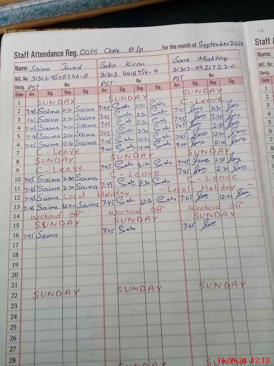 | CNIC | Full Name | Designation | R/C | Absence during last cal. month |