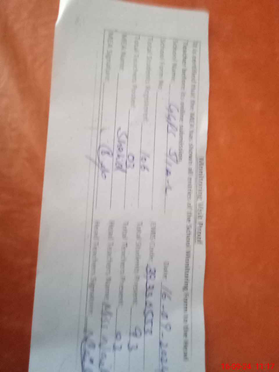 | Monitoring Date: 16-09-2024 | Start Time: 16-09-2024 11:00 AM | End Time: 16-09-2024 11:17 AM | Name of MEA: SH**** YO**** | |