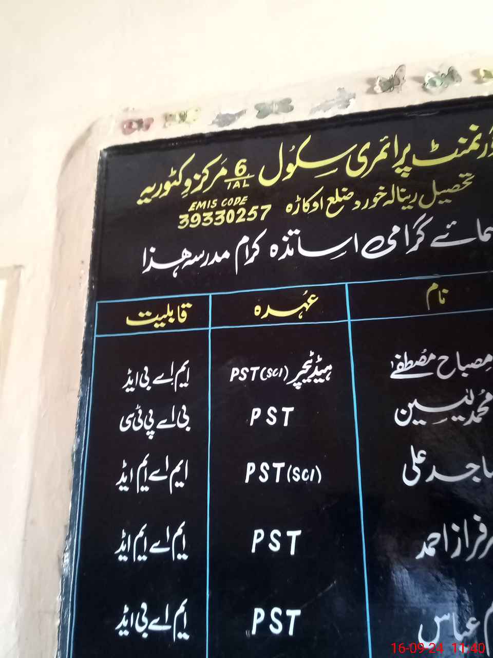 | District: OKARA | Tehsil: RENALA KHURD | Markaz: VICTORIA -MALE | Level: Primary | |