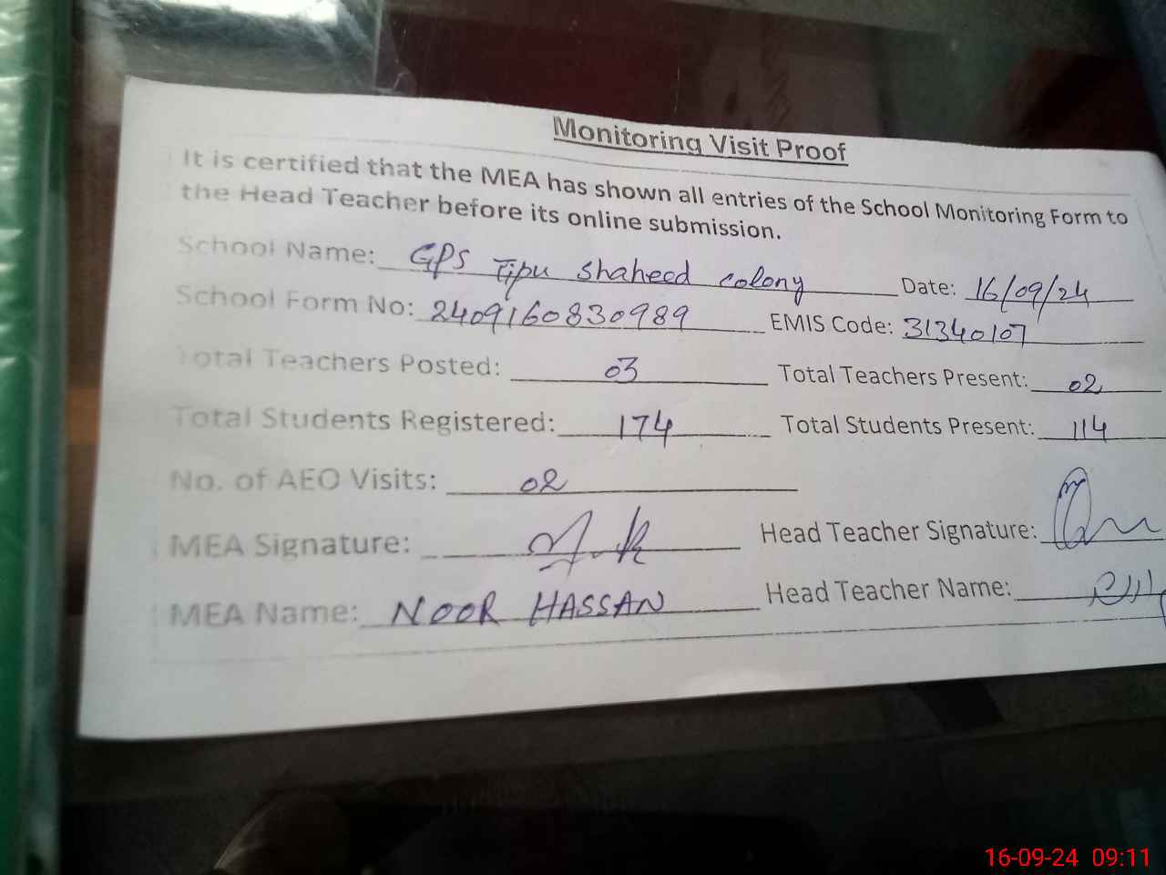 | Attendance Register | Head Teacher | MEA with School | Visit Proof |