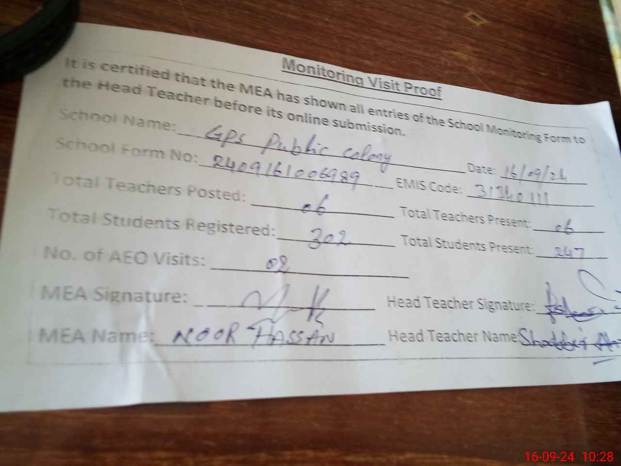 | Attendance Register | Head Teacher | MEA with School | Visit Proof |