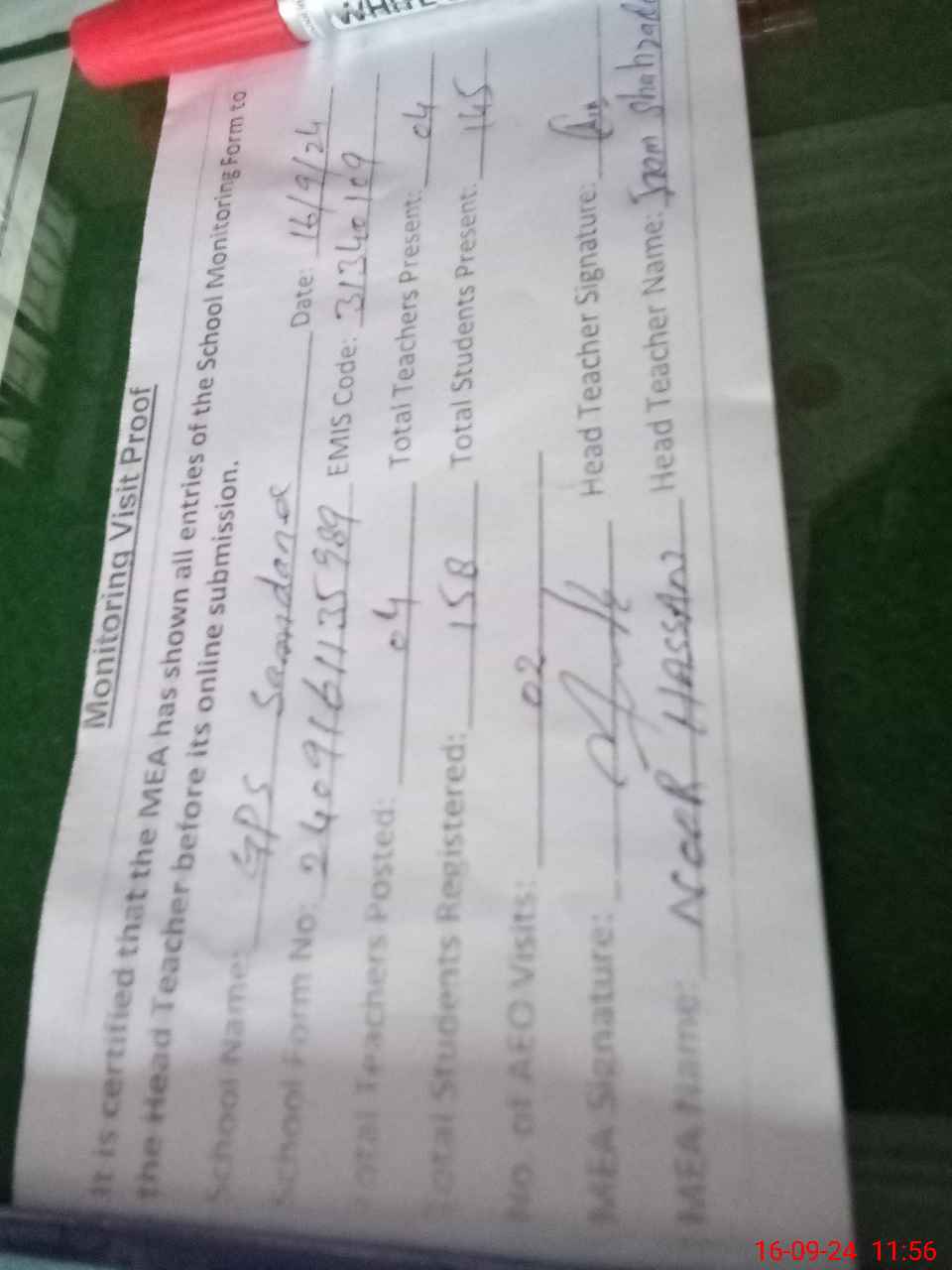 | Attendance Register | Head Teacher | MEA with School | Visit Proof |