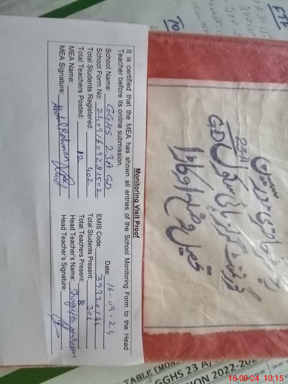| Attendance Register | Head Teacher | MEA with School | Visit Proof |