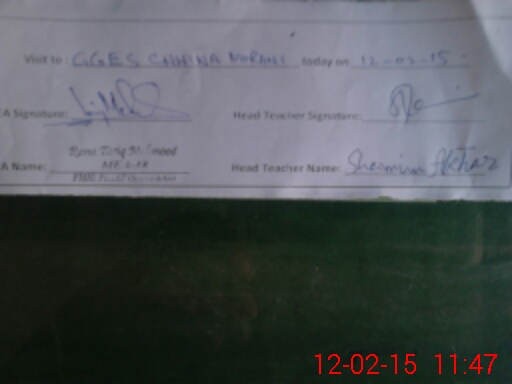| School Visited by School Health & Nutrition Supervisor (No. of Visits) | 1 | Name1: | SADIA | Name2: | |