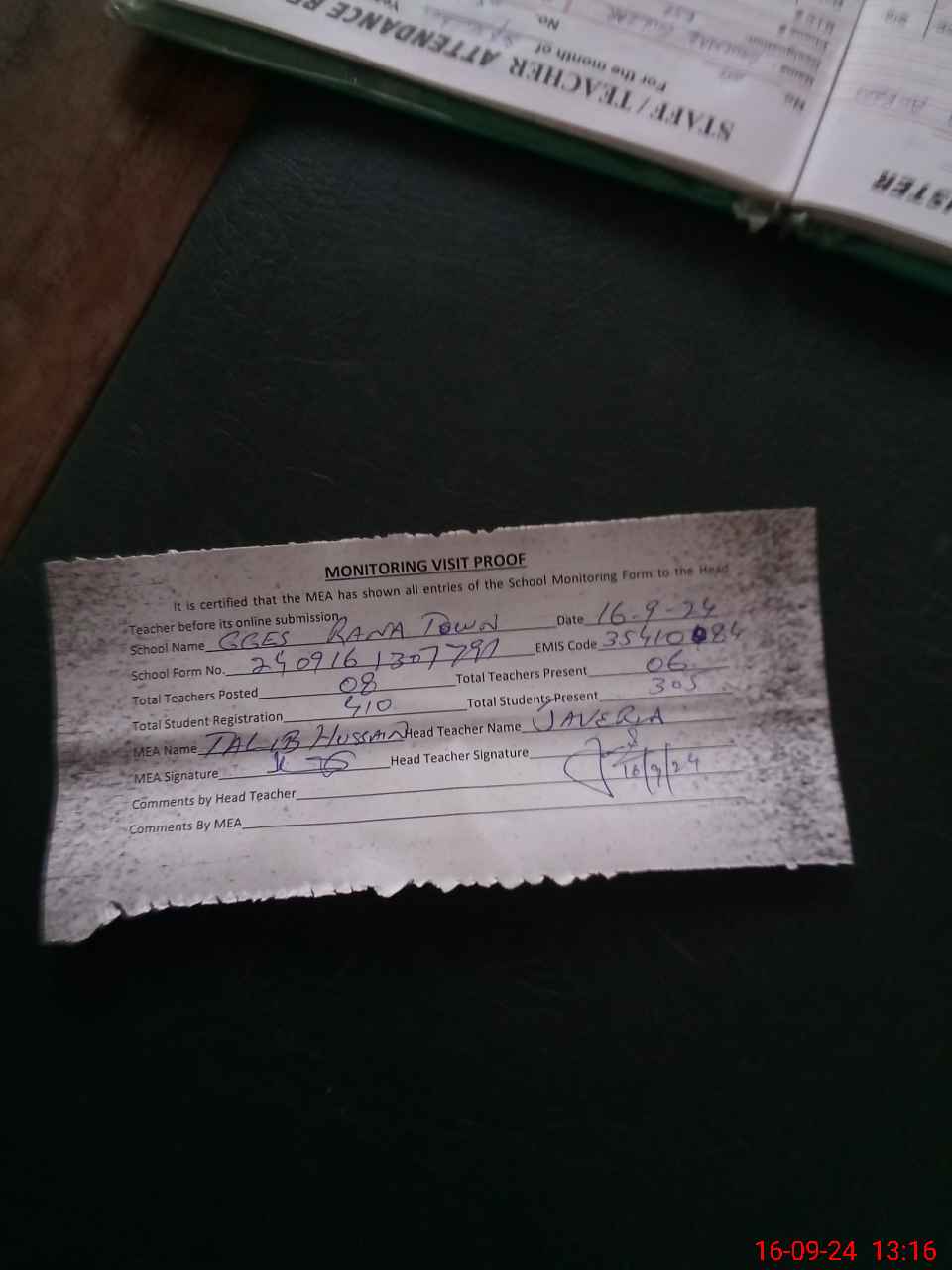 | Attendance Register | Head Teacher | MEA with School | Visit Proof |