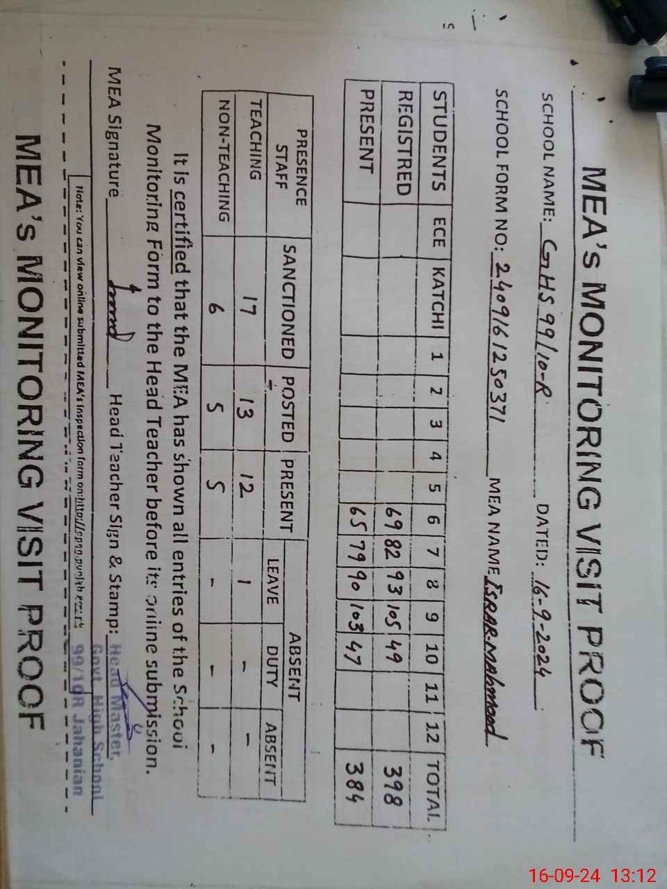 | Attendance Register | Head Teacher | MEA with School | Visit Proof |