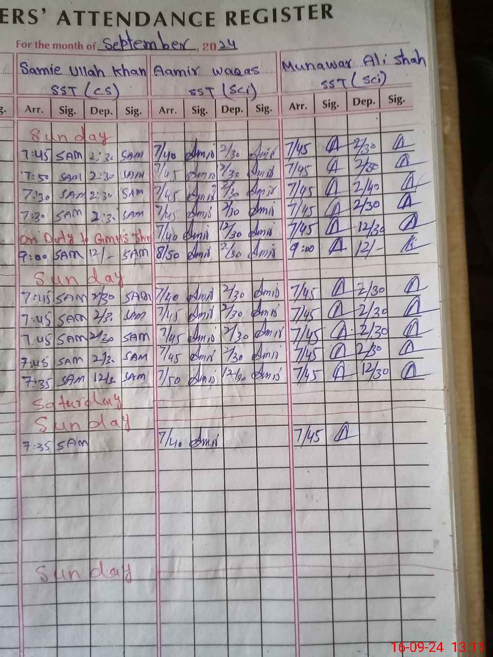 | CNIC | Full Name | Designation | R/C | Absence during last cal. month |