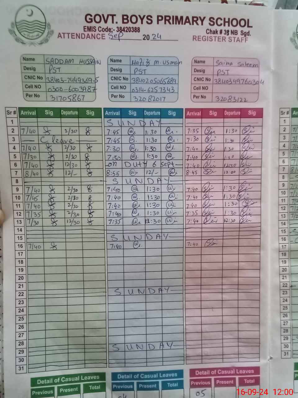 | CNIC | Full Name | Designation | R/C | Absence during last cal. month |
