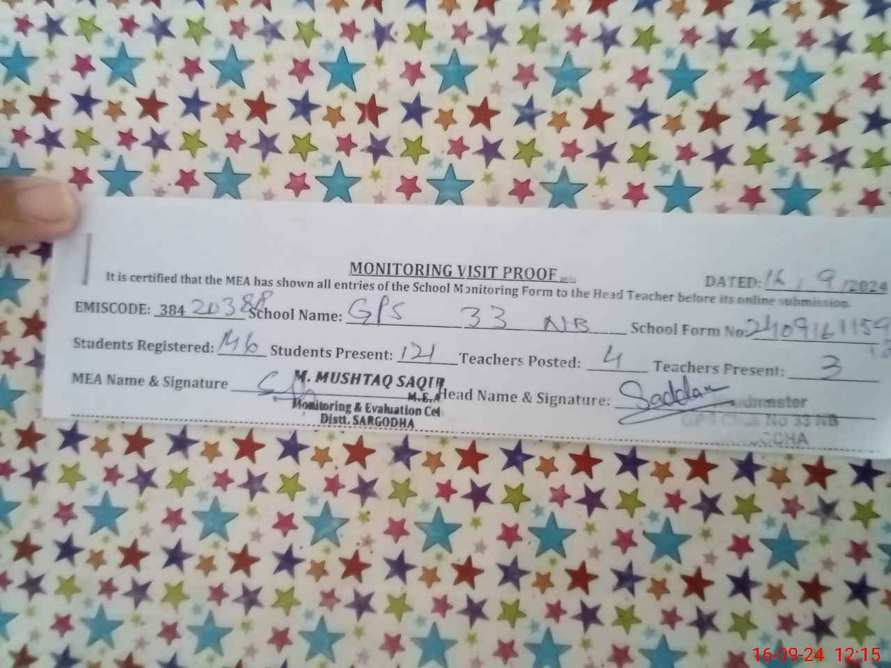 | Name: SA**** HU**** Designation: (School Headmaster's/Headmistress's) PST Phone/Cell Number: 03**** |