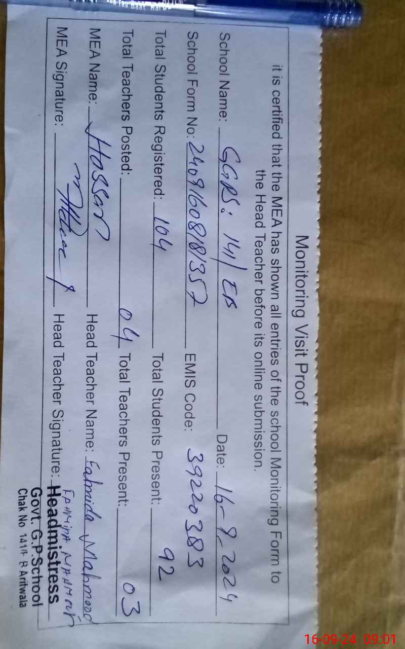 | EMIS Code: 39220383 | Name of School: GGPS 141 EB TEH ARIFWALA | |||