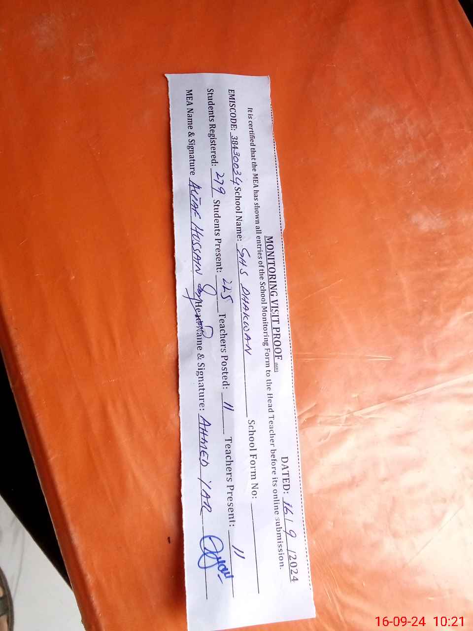 | Attendance Register | Head Teacher | MEA with School | Visit Proof |