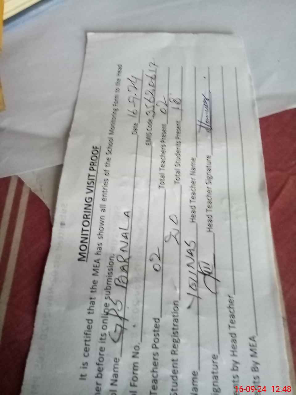 | Attendance Register | Head Teacher | MEA with School | Visit Proof |