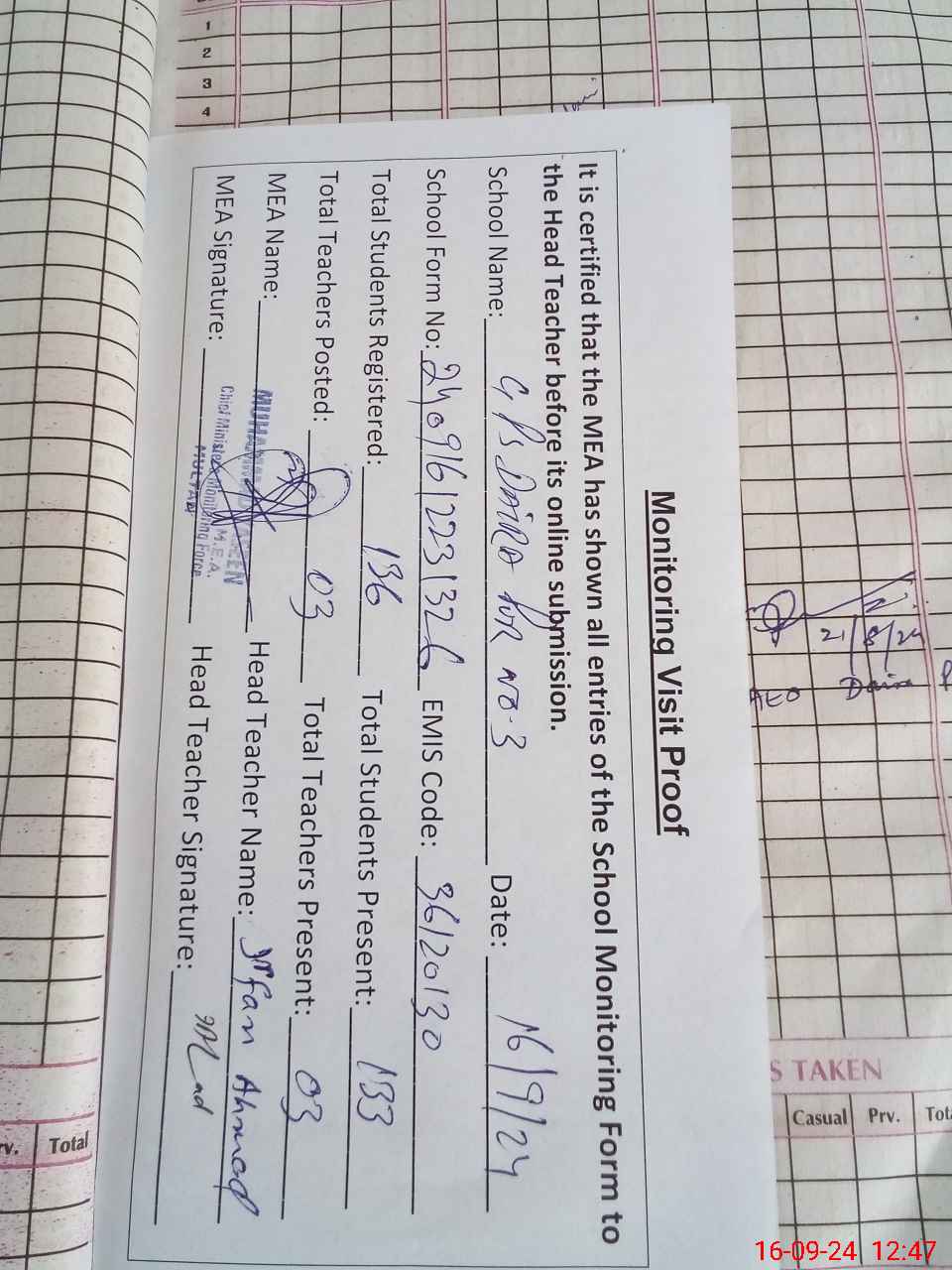 | Attendance Register | Head Teacher | MEA with School | Visit Proof |