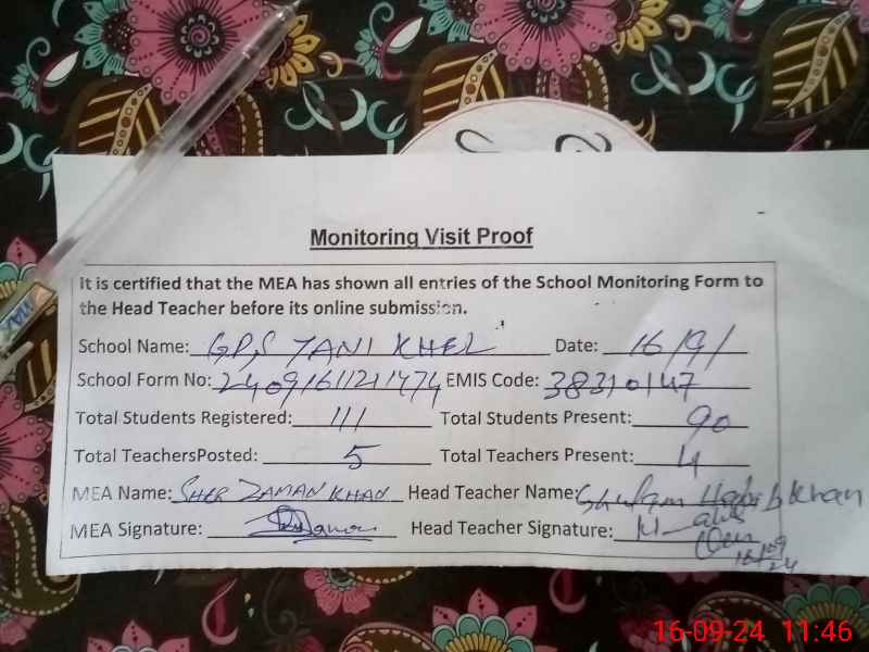 | EMIS Code: 38310147 | Name of School: GPS TANI KHEL P/O KAMAR MUSHANI ISA KHEL | |||