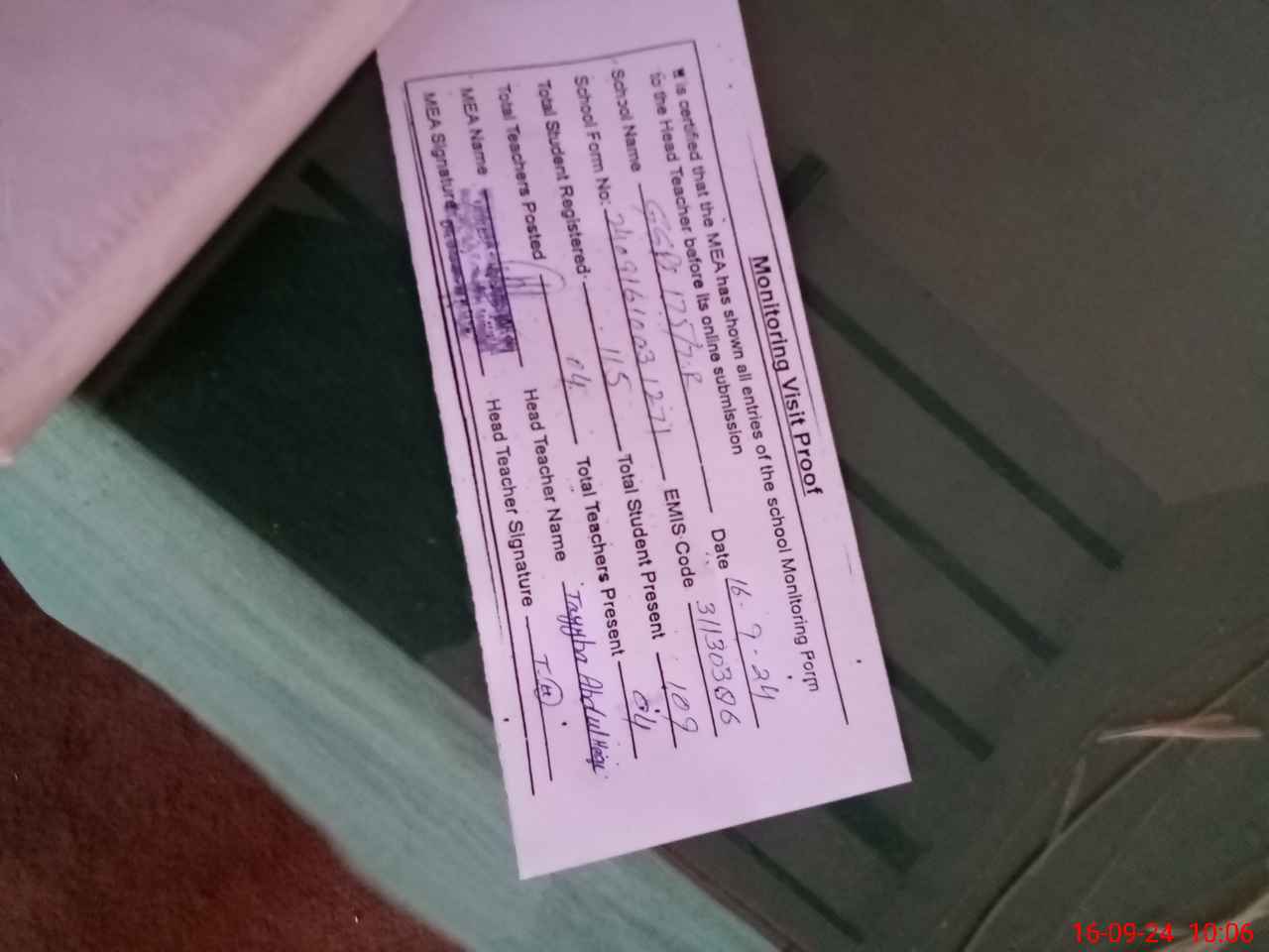 | Attendance Register | Head Teacher | MEA with School | Visit Proof |