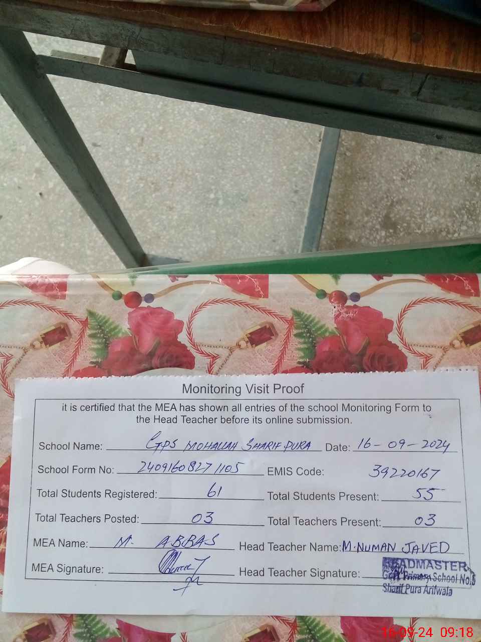 | EMIS Code: 39220167 | Name of School: GPS MOHALLA SHARIF PURA | |||