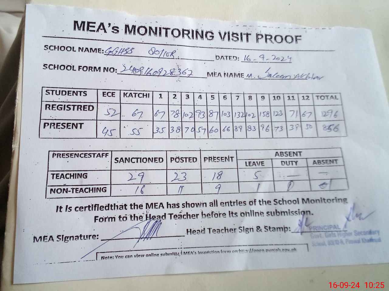 | Certified that this School was Inspected by the Undersigned MEA/DMO Today and the Information Stated Above is as Per Record. | |||||