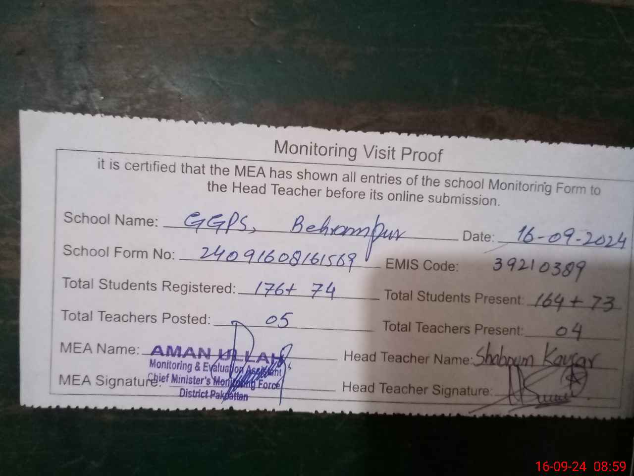 | EMIS Code: 39210389 | Name of School: GGPS BEHRAM PUR | |||