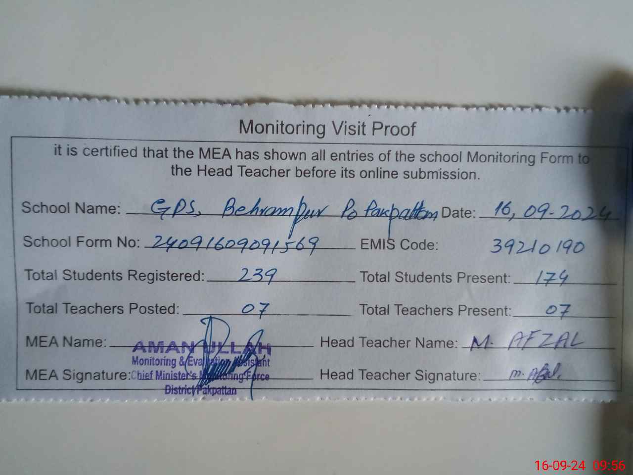 | EMIS Code: 39210190 | Name of School: GPS BEHRAM PUR PO PAKPATTAN | |||