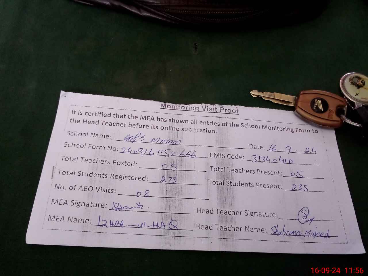 | Attendance Register | Head Teacher | MEA with School | Visit Proof |