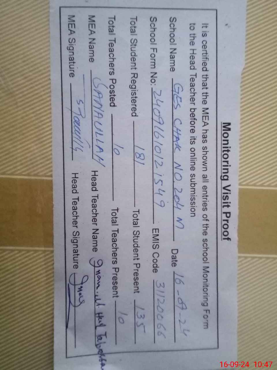 | EMIS Code: 31120066 | Name of School: GES CHAK NO. 204/M | |||