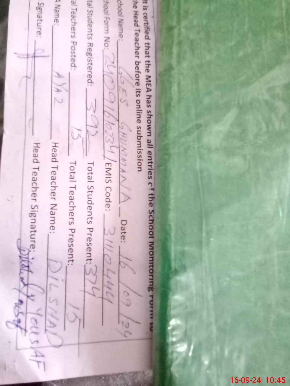 | Name: DI**** YO**** Designation: (School Headmaster's/Headmistress's) S.S.T.(genarel) Phone/Cell Number: 03**** |